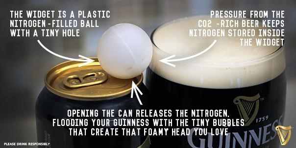 This mechanism plays an important role for the Guinness as the cans are pressurized by having liquid nitrogen added into them during manufacturing. In turn, the nitrogen will vaporize once the can is sealed and enter the plastic ball through a small entrance alongside some beer. Thus, upon cracking open a can of Guinness, the high pressure from within the widget forces the nitrogen out into the beer, ultimately creating that creamy head we all look for in our usual pint of Guinness.