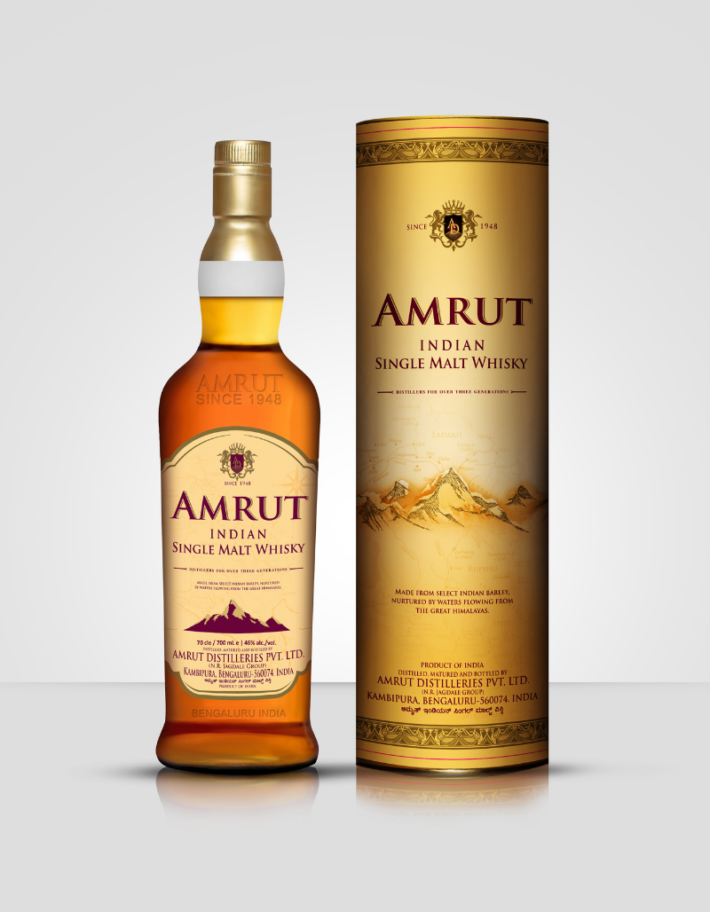 AMRUT Single Malt. Distilled from barley grown at the North West of India. Amrut mature their single malt in New American Oak and ex-bourbon before bottling.