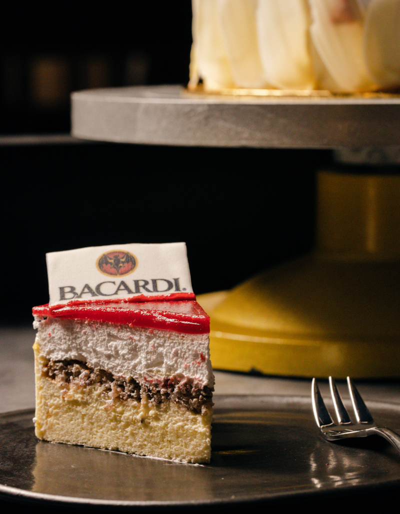 2 layers of vanilla cake soaked with Rum , a layer of raspberry jelly (with Rum) and marinated raisin in rum, white chocolate mousse , decorated with Raspberry Rum Jelly and white chocolate shards.