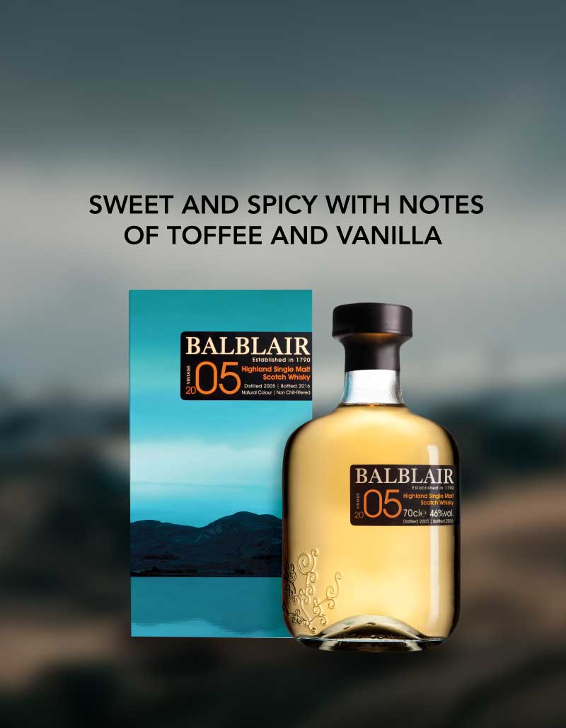 Balblair’s signature style of citrus orchards is followed by intense sweetness of toffee and vanilla
