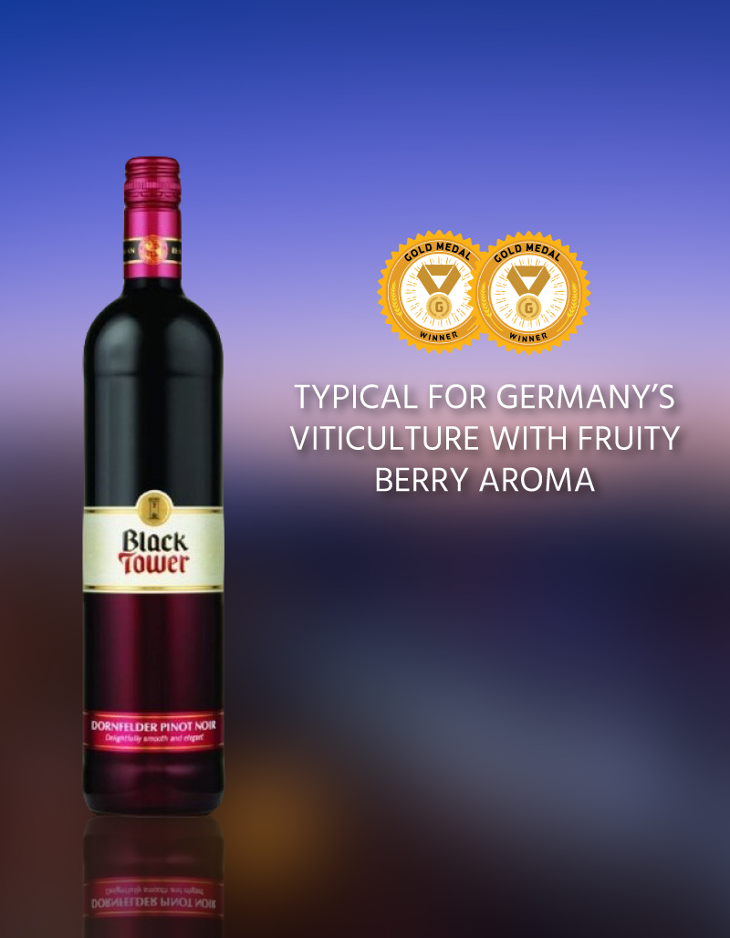 Black Tower is Germany's most widely exported branded wine. With its fresh appealing style it meets the needs of today's ever more discerning consumer. A combination of selected grapes from prime wine-growing areas and careful vinification ensure Black Tower wines are always enjoyable. The grape varieties Dornfelder and Pinot Noir are typical for Germanys viticulture. Their fruity berry aromas are developing perfectly under the cool climate conditions in Germanys wine growing regions.