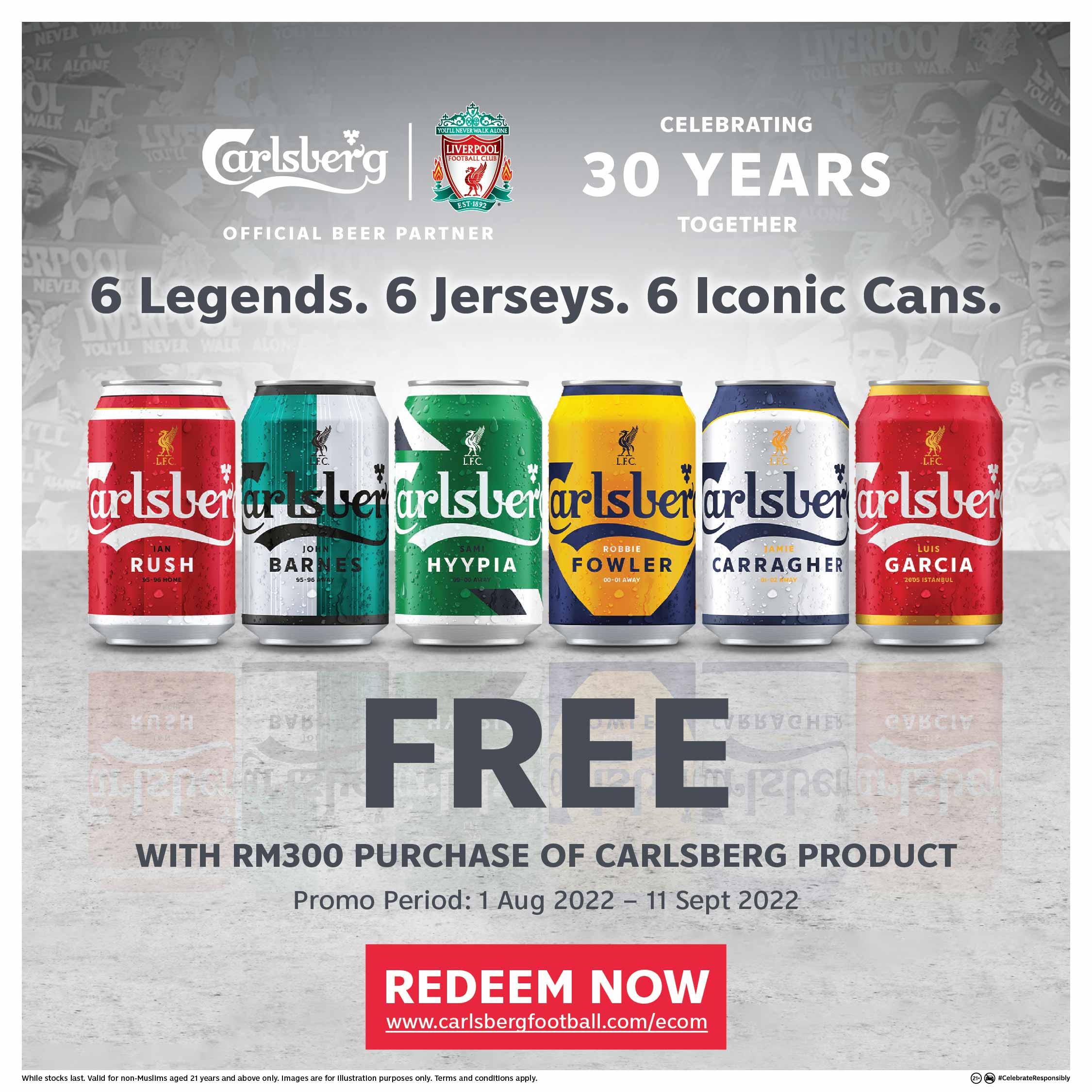 Buy RM 300 worth of Carlsberg products (Carlsberg Danish Pilsner, Smooth Draught and Special Brew only), you get to redeem 1 set of 6 limited edition LFC cans.