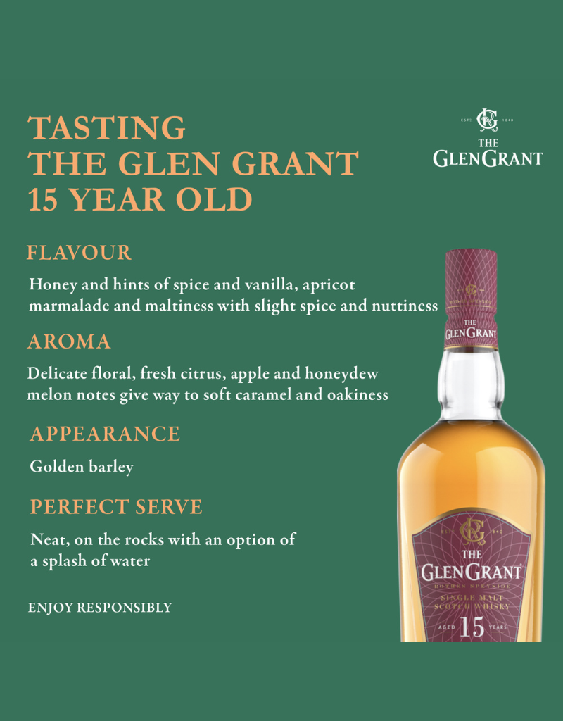 Master Distiller Dennis Malcolm crafted the 15 Year Old single malt Scotch whisky at 50% ABV batch strength, which resulted in a profound expression of The Glen Grant’s signature style. It offers a rich palate of spiced pear, apricot, and vanilla, leaving a nutty finish with delicate notes of fruit.