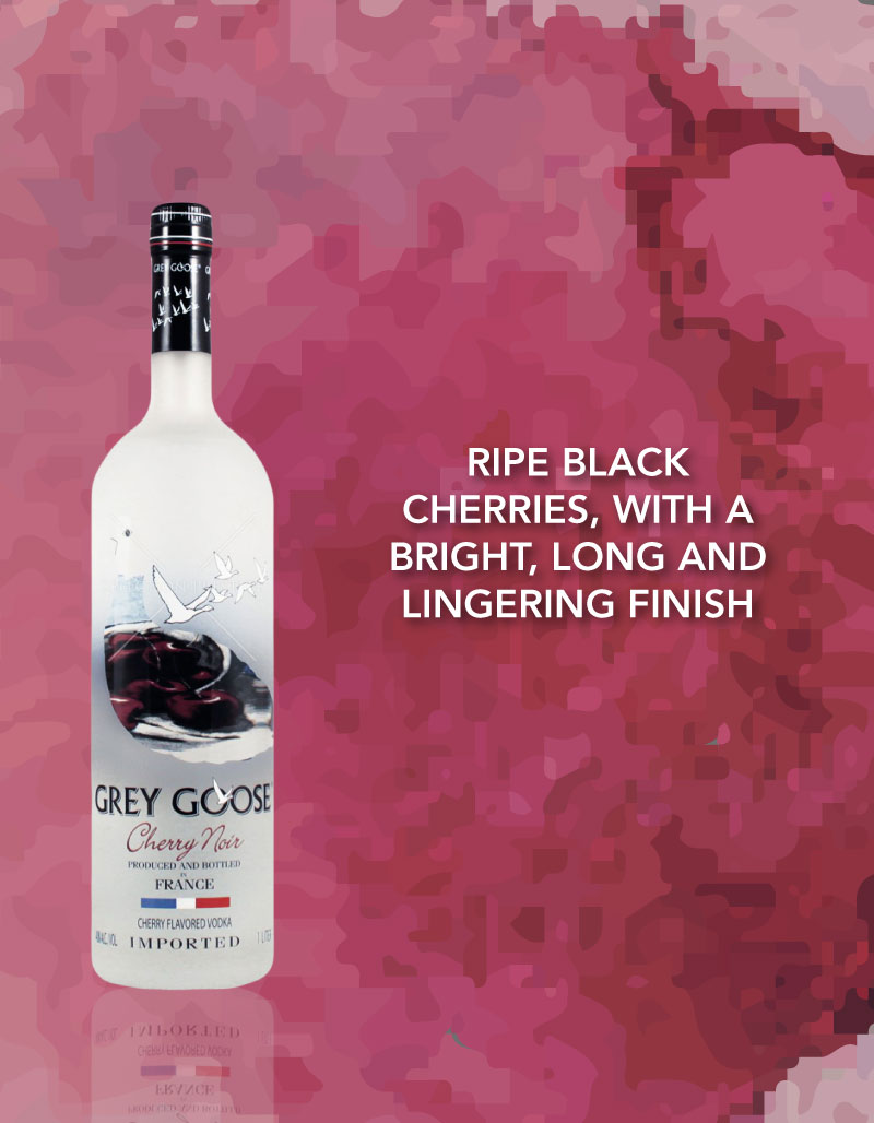 GREY GOOSE® Cherry Noir Flavored Vodka is created by utilizing the 100% natural essence of ripe black cherries, partially handpicked by local farmers from the steep hillsides of the French countryside. This is blended with GREY GOOSE® Vodka, a spirit distilled from French wheat and made with naturally filtered spring water from Gensac-la-Pallue. This cherry flavored vodka exudes a spirit characterized by the seductive taste of ripe, aromatic black cherries.
