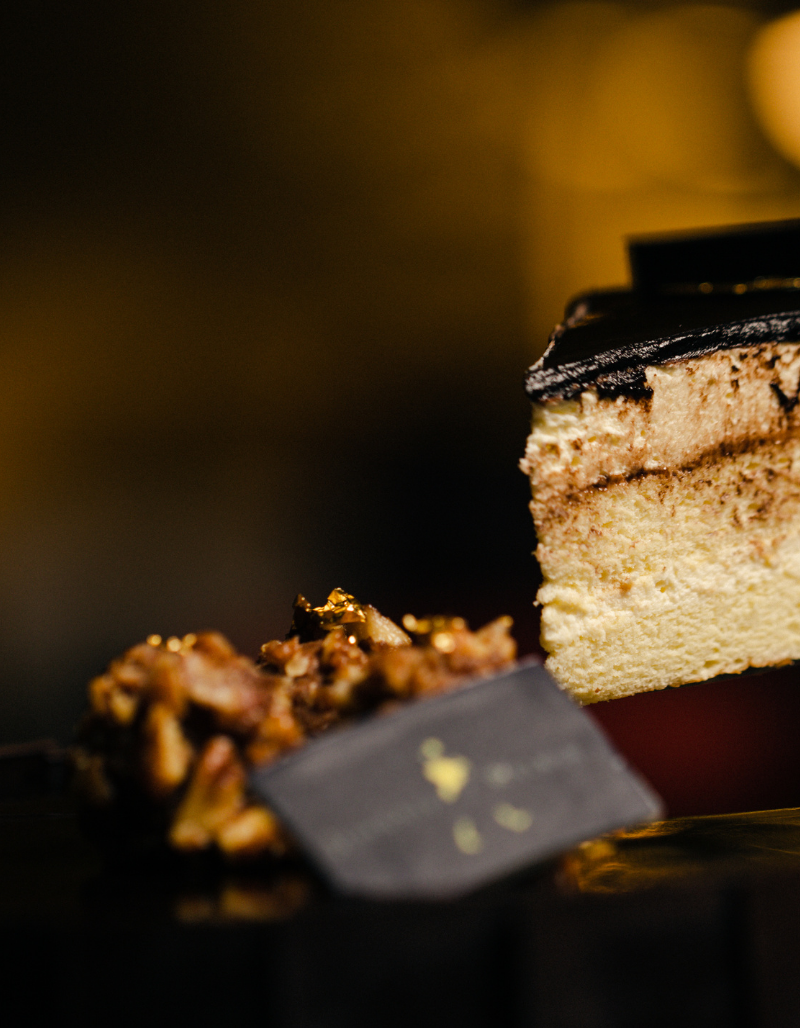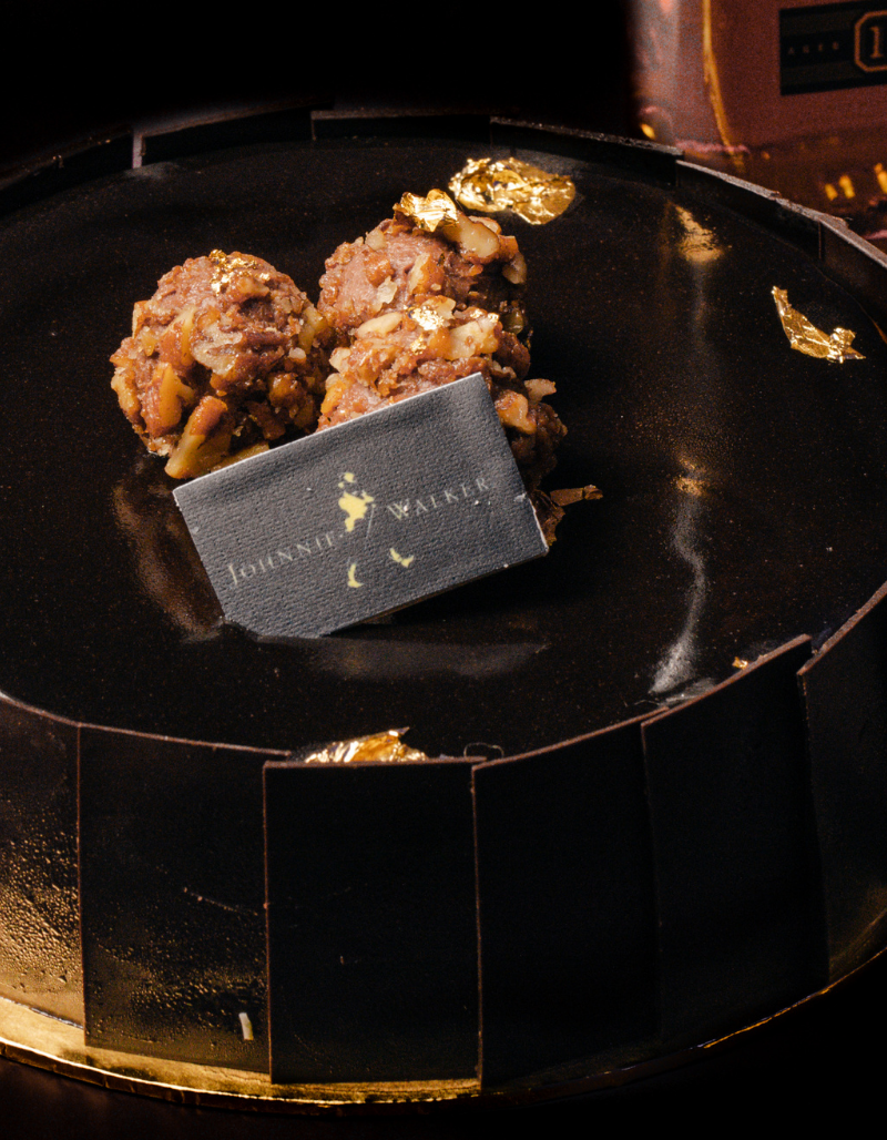 2 layers of chocolate cake soaked with whisky , a layer of honey pecan insert , whisky milk choc mousse , decorate with dark choc shards, chocolate glaze and 3 pieces of whisky pecan truffle.