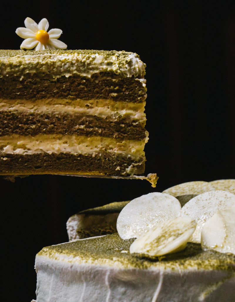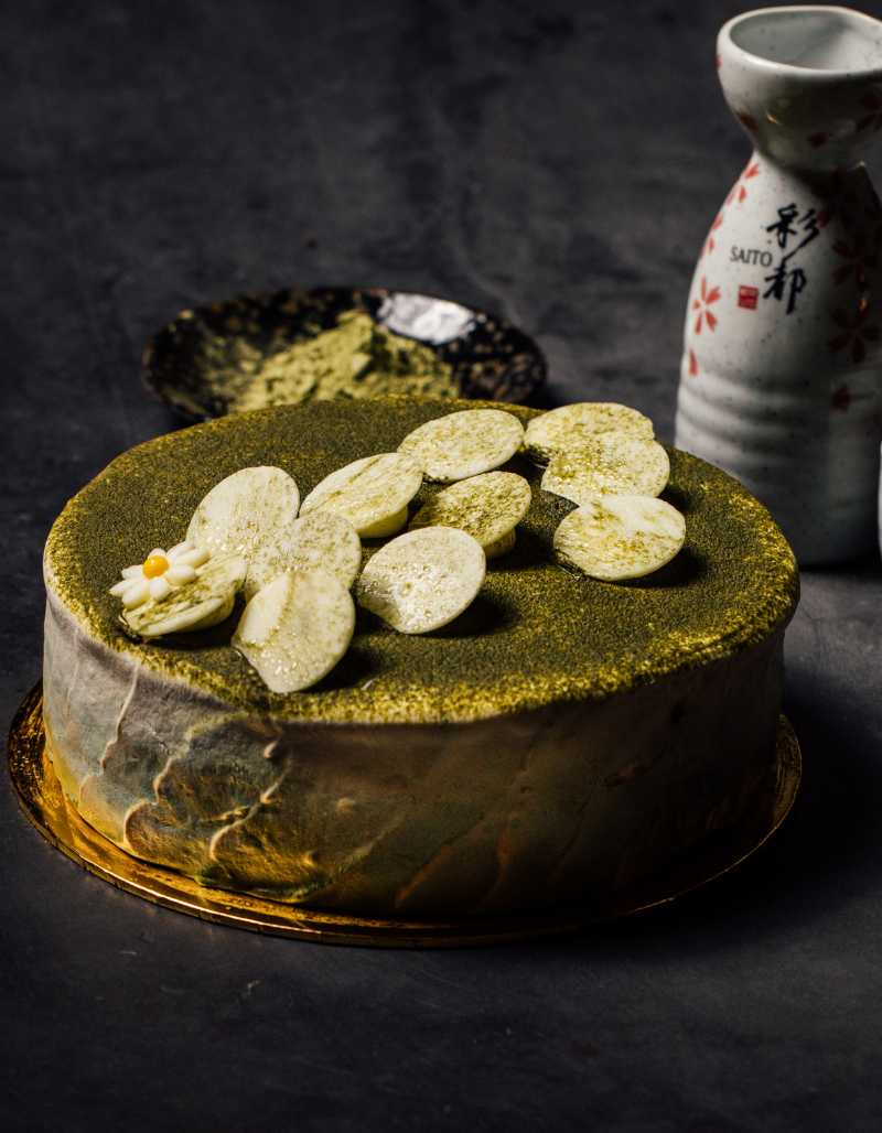 3 layers of green tea chiffon soaked with sake , layers of sake pâtissier cream , coated with dairy cream , decorated with matcha powder and white chocolate disc.