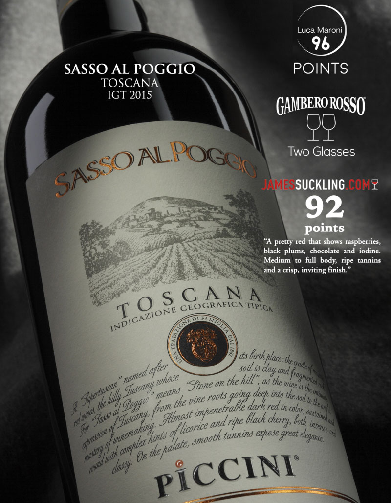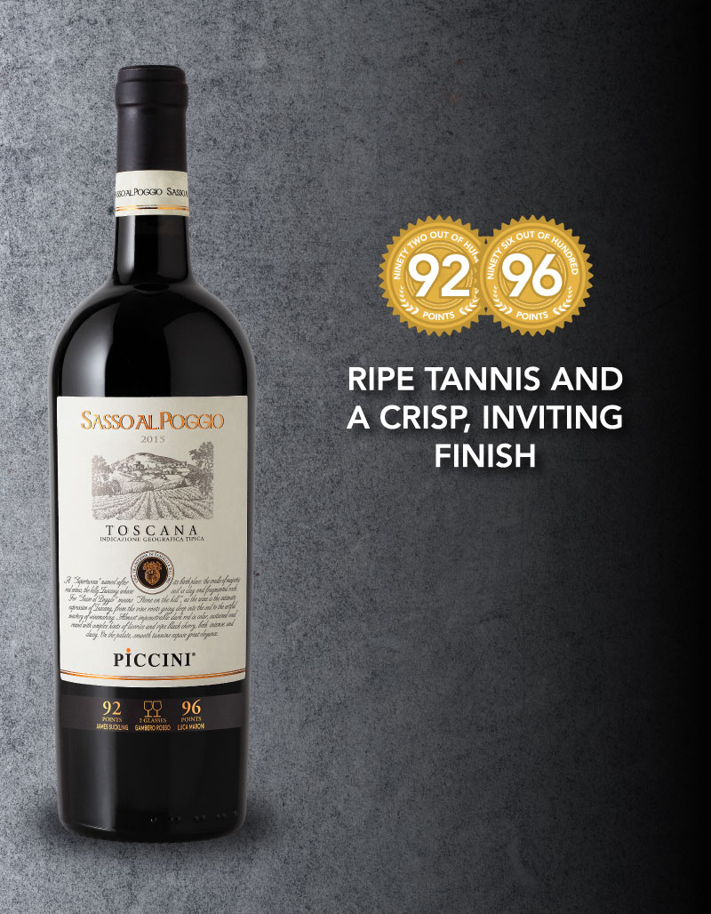 “Supertuscan” named after its birth place: the cradle of majestic red wines, the hilly Tuscany whose soil is clay and fragmented rock. For “Sasso al Poggio” means “Stone on the hill”, as the wine is the intimate expression of Tuscany, from the vine roots going deep into the soil to the artful mastery of winemaking.