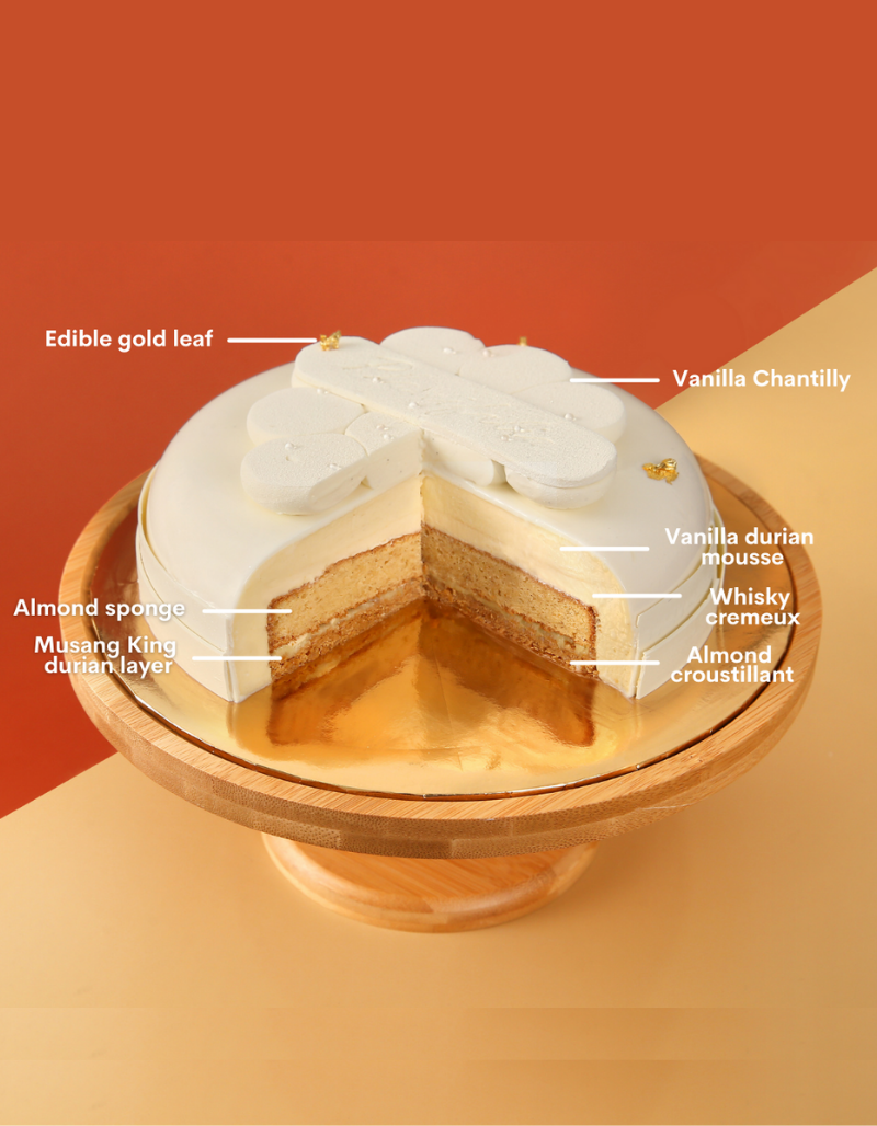 I promise you, it taste as good as it looks! Almond croustillant and almond sponge provides a nutty base, topped with a layer of Whisky Cremeux and Musang King vanilla mousse. Piped to style using vanilla chantilly and glazed to perfection.