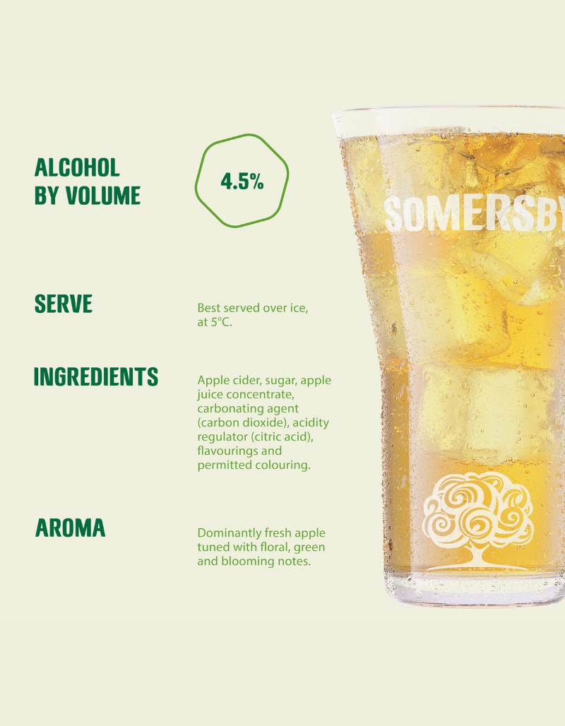 Cider: An ideal refreshing summer drink with natural apple flavour, that will definitely make you have another one. Somersby Apple Cider is an invigorating and refreshing cider made from quality fermented apple juice and natural apple flavouring. There are no artificial sweeteners, flavours or colourings used in the making of this premium cider whose unique taste makes it a tasty and natural choice for the relaxed moments with your friends.
