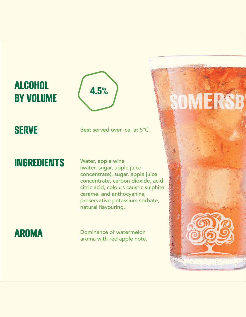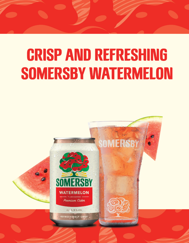 A tropical mélange of fresh watermelon, crisp red apple and fruity strawberry, Somersby Watermelon cider is a refreshing thirst quencher. A fun twist on the classic apple-based original, it is light-bodied with intense fruitiness.
