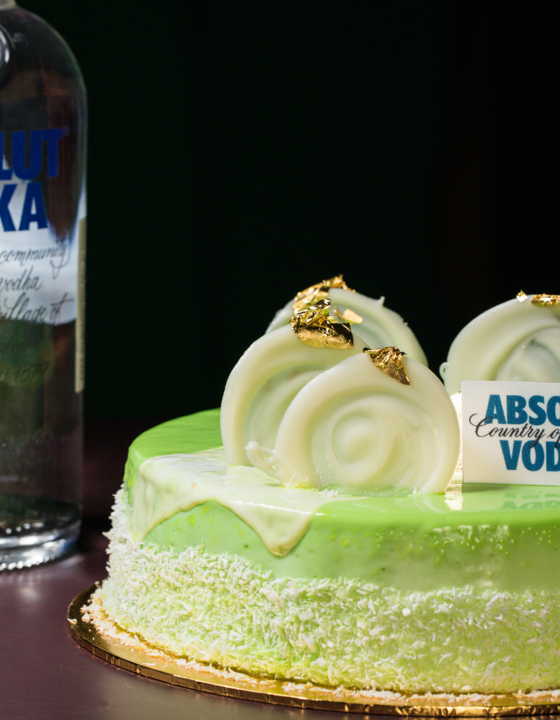 2 layers of vanilla cake soaked with vodka , vodka white chocolate coconut mousse with pandan extract , green whites chocolate glaze , decorated with white chocolate disc and desiccated coconut.